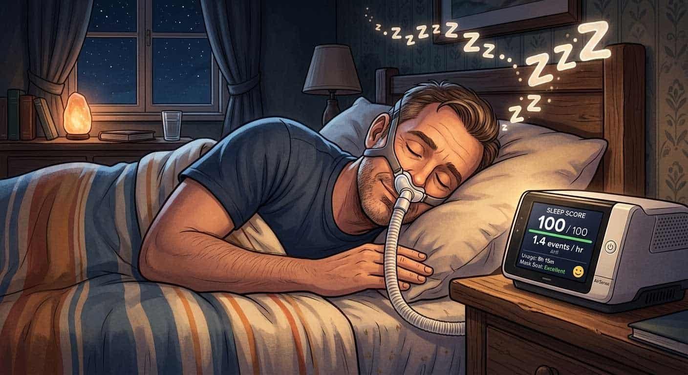 Nine hours and twelve minutes of CPAP usage. A score of 100 out of 100. An AHI of 1.4 events per hour — the lowest of the entire series. Mask seal: Good. Mask-off events: just one, across an entire night of continuous therapy that stretched past nine hours. This is the second consecutive night scoring 100 out of 100, following Day 19’s perfect score with 7 hours 59 minutes of usage — but it is the duration figure that makes Day 20 the undisputed champion. The previous longest session was 8 hours 19 minutes on Day 8. Tonight’s number smashes that by nearly a full hour.